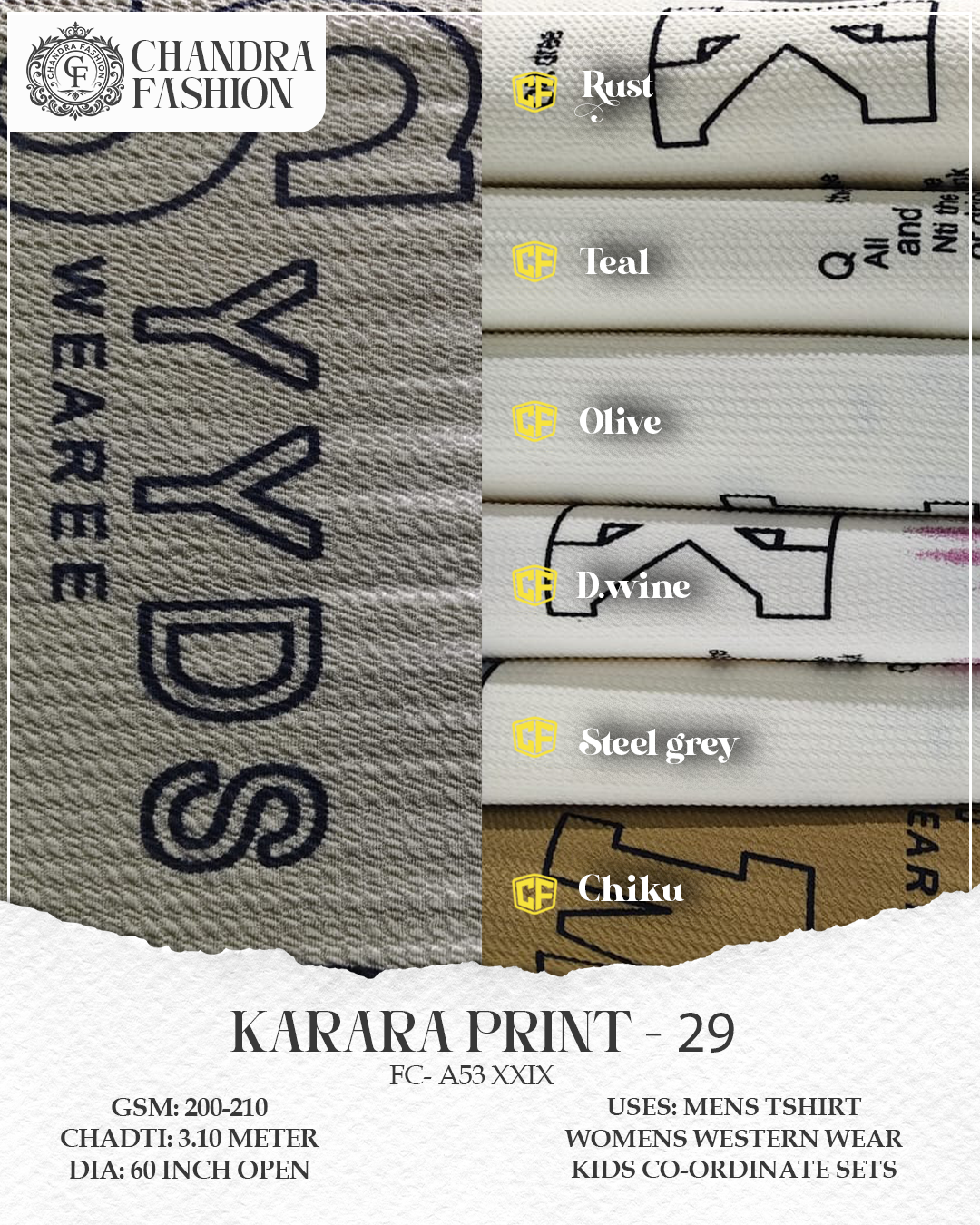 Top wear Fabric , T shirt Fabric , Bottom Wear Fabric , Lower Wear Fabric and Co-rd Sets Fabric